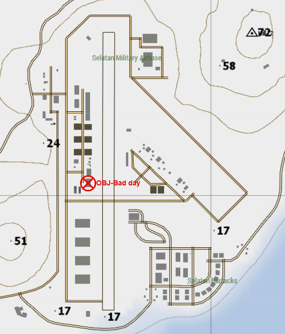 A) After briefing PHANTOM 1 shall mount up in a helicopter and fly to LZ Ash. While en-route to LZ Ash an EMP strike will go off in the middle of Selatan Military Airbase, this will render the CSAT night vision, vehicle, and base lights useless. B) Once PHANTOM 1 has landed at LZ Ash they will move along the black line, through way-points 1-4 until they reach the exterior of the base. C) When PHANTOM 1 reaches WP-4 they will plan out the movement into OBJ Bad Day, by assessing the patrols with their drone. After the nuclear device has been disabled, PHANTOM 1 will extract the same way they inserted.